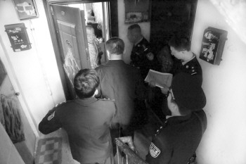 | 因为是凌晨行动,睡梦中的“老赖”被堵在家中,还穿着睡衣。 本报记者 韩逸 摄 |