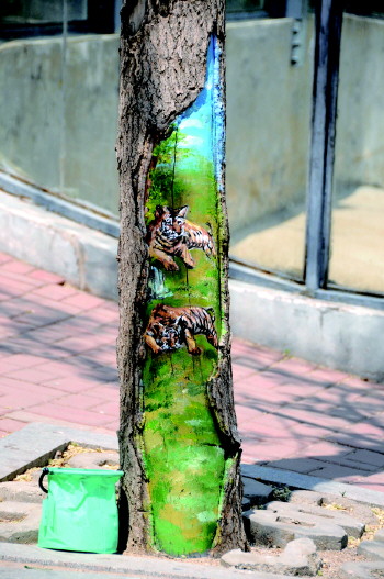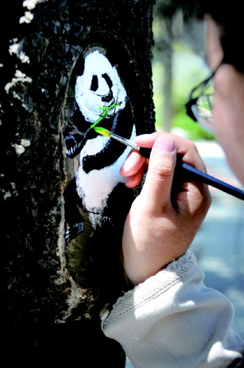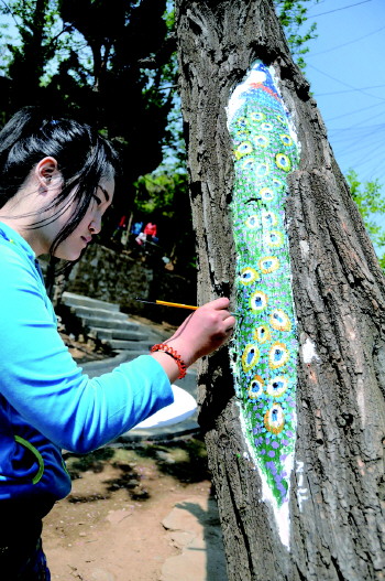 原来,山东省城市服务技术学院的同学们正利用树疤和树洞作画。指导老师董郭英说,同学们作画用的是丙烯颜料,不会对树木造成破坏。
