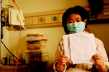 | 面对护士送来的住院费用明细,谭相菊满面愁容。 本报记者 李军 摄 |