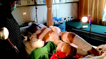 | 生命垂危的孙洪芹仍不停地询问着儿子的情况。 本报记者 袁慧 摄 |