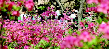 由于气候偏暖,原本5月才绽放的大珠山映山红(杜鹃花的一种)现在就已经陆续绽放,红彤彤的映山红红遍大珠山的山坡、溪边和悬崖峭壁。