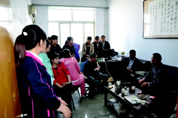 | 在服装公司办公室内,工人正在讨薪。殷萍 摄 |