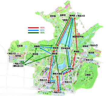 本报记者 蓝娜娜 快捷路线 A线路:2号口入园——鲜花大道——中华园——草纲园——童梦园——天水沿水步道——绿业园——国际园——3号口出园。 B线路:3号口入园——国际园——茶香园——绿业园——童梦园——中心广场——地池——中华园——鲜花大道——2号口出园。 C线路:5号口入园——百花园——茶香园——绿业园——童梦园——中心广场——地池——中华园——鲜花大道——国际园——5号口出园。 时间路线 3小时游览路线:入园——乘电瓶车至中华园——鲜花大道——国际园——地池、主题景观广场、天水——绿业园——科学园——主题馆(游览30分钟)——植物馆(游览20分钟)——出园。该线路适合时间紧的游客,主要展馆下车游览,其余园区有讲解员车上讲解世园会。 4小时游览路线:入园——乘电瓶车至植物馆(游览30分钟)——乘电瓶车至主题馆(游览40分钟)——乘电瓶车经科学园——天水服务区(讲解)——地池服务区——国际园——园艺文化中心(游览30分钟)——中华园——出园。该适合时间较紧的游客,主要讲解服务安排车上讲解,预留客人拍照的时间。 5小时游览线路:入园——乘电瓶车至植物馆(游览40分钟)——乘电瓶车至主题馆(游览60分钟)——乘电瓶车经科学园——天水服务区(下车拍照、讲解)——由天水转入茶香园——农艺园——蔬艺馆(游览20分钟)——百花园——国际园——园艺文化中心(游览30分钟)——中华园——出园。 6小时游览路线:入园——乘电瓶车至植物馆(游览40分钟)——睡莲博物馆(游览20分钟)——主题馆(游览60分钟)——科学园——天水服务区(午餐)——由天水转入茶香园、农艺园——蔬艺馆(游览20分钟)——百花园——国际园(参观主要展园)——园艺文化中心(游览30分钟)——中华园(参观主要展园)——出园。该线路适合时间较为充裕的游客,线路几乎涵盖园区所有展馆,能全方位感受世园会。 8小时游览路线:入园——中华园(参观主要展园)——园艺文化中心(游览30分钟)——鲜花大道——国际园(参观主要展园)——地池(午餐)——百花园——茶香园(视情况品茶)——绿业园——科学园——主题馆(游览80分钟)——童梦园——睡莲博物馆(游览30分钟)——草纲园——植物馆(游览60分钟)——出园。 特色路线 亲子之旅:入园——乘缆车至童梦园——飞花区——主题馆——梦幻科技馆——绿业园——百鸟园——地池——山地园——中华园——出园。该线路顺应山势由高处向低处游览,较为节省体力,适合带着小朋友的家庭。 世园全景之旅:入园——中华园——花艺园——植物馆——草纲园——睡莲博物馆——童梦园——主题馆——梦幻科技馆——科学园——绿业园——天水——茶香园——农艺园——花卉园——百花园——地池——国际园——鲜花大道——出园。该线路涵盖世园会园区所有特色展园、展馆,适合时间充裕的青年游客。 登山健身之旅:入园——鲜花大道——国际园——百花园——茶香园——绿业园——科学园——森林剧场——梦幻科技馆——主题馆——天水木栈道——草纲园——睡莲博物馆——植物馆——出园。该线路顺应山势由低处向高处游览,适合体力较好的登山爱好者。 园艺摄影之旅:入园——中华园——山地园——花艺园——植物馆——草纲园——天水木栈道——童梦园——主题馆——绿业园——主题景观广场——地池——国际园——出园。该线路是为摄影爱好者设计的线路,游客可在视野开阔的高地,拍摄景致独特的园区。 互动参与之旅:入园——鲜花大道——国际园——百花园——茶香园——嘉年华——绿业园——梦幻科技馆——4D影院——主题馆——睡莲博物馆——植物馆——中华园——山地园——出园。适合错峰游览,主要贯穿园区互动体验区,强调园区的参与性。