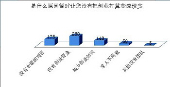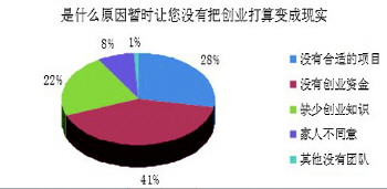 是什么原因暂时让创业者没有把创业打算变成现实 图表分析:41%的打算创业者因为缺少创业资金而暂未创业,28%的打算创业者因为没有合适的项目而暂时没有将创业想法转化为现实,22%的人是因为缺少创业知识。所以,想创业而暂未创业的人,如何获取创业资金成为关键。如何帮助这些人发掘合适的创业项目及传授创业方面的知识也尤为重要。