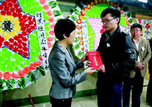 | 捐赠仪式上,刘洪胜的儿子接过颁发的荣誉证书,脸色平静。 本报通讯员 董再展 摄 |