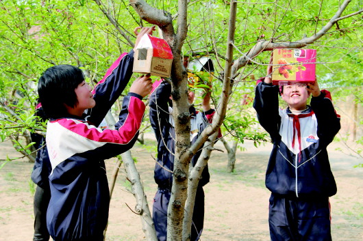 | 学生们将自制的鸟巢挂在树上,给小鸟们安家。 |
