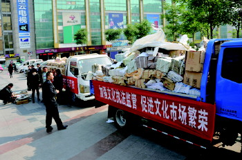 | 在义乌小商品城,执法人员对非法出版物进行销毁。本报记者 王鸿哲 摄 |