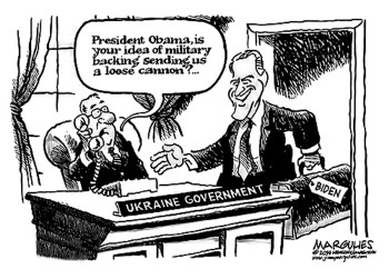 面对破门而入的美国副总统拜登,乌克兰政府高官对着电话说:“奥巴马总统,你的军事援助计划就是给我们派来一个夸夸其谈的‘大炮’吗?”拜登21日抵达基辅,对乌克兰开展为期两天的访问,拜登此行被视为对乌克兰亲西方领导人的支持。 (原载美国报刊漫画家协会网站)