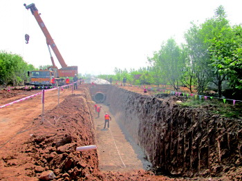 | 25日,地表水转换地下水工程的玉清线正在铺设管道。
