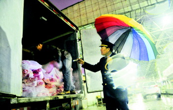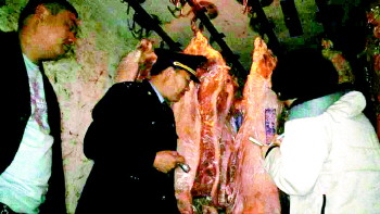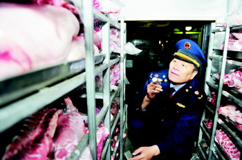 | 28日凌晨,薛为怀在冰冻的货车厢里仔细查看猪肉。 |  | ▲和货车司机交流时,薛为怀寻找蛛丝马迹。 |  | ◥不管下雨下雪,检测猪肉的活都不能耽误。 |