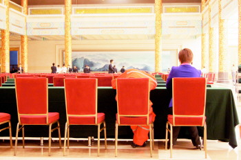 | 还没开始讲话,有些累的吴吉林先趴会儿。 本报记者 张榕博 摄 |