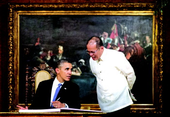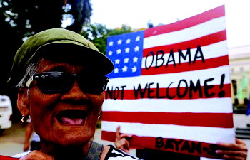 | 4月28日,菲律宾总统阿基诺三世于马拉卡南宫接待美国总统奥巴马。 东方IC供图 |  | 4月28日,菲律宾一名老妇参与游行,背后的星条旗上写着“菲律宾不欢迎奥巴马”。 |
