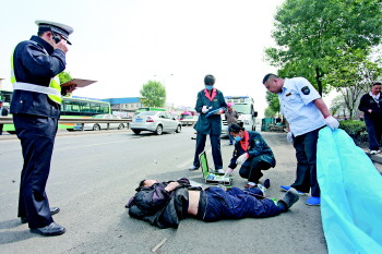 本报96706热线消息(记者 张泰来 实习生 李倩) 28日上午,省城工业北路发生一起交通事故,一辆白色轿车和一辆电动三轮车相撞,导致三轮车上一人当场死亡,另一人身受重伤。 “工业北路郭店附近发生一起交通事故,至少两人受伤。”28日上午9点34分,济钢总医院急救中心接到了一个急救电话。 “因为知道有两名伤者,我们派去了两辆急救车。”济钢总医院工作人员李先生介绍,当他们赶到现场时发现,一名女性伤者躺在路中间,另一名50多岁的男性伤者躺在路边。 “两人的伤势都非常严重,女伤者情况稍好,虽然昏迷,但生命体征还正常,我们就把她抬上急救车拉回医院救治。”李先生说,男性伤者的情况更为危重,医务人员在现场就对他实施了抢救,但不到一会儿男性伤者“瞳孔就大了”,失去了生命体征。 上午10点,记者赶到了事故现场,看到发生事故的是一辆银色的小轿车,车盖翘起,车牌也在事故中脱落,前挡风玻璃破碎,汽车内部的安全气囊也处于打开状态,在车辆周围散落着一些汽车零件碎片。 发生事故的三轮车是一辆绿色的电动三轮,侧倒在车辆后面两三米远的地方,前轮整个从车体脱落,只有一只黑色的棉鞋,一只红色的袜子和一个装有充电器的旅行包留在地上。 据现场目击者介绍,当时三轮车正从道路北面的一条小路由北向南行驶,打算在路口左转向东,银色轿车正自西向东行驶,不知是什么原因,两车就撞在了一起。 “没看到具体过程,听到一声响,抬头就看到撞在一起了。”路边小卖铺店主王先生说。 记者发稿前从济钢总医院得知,事故中的女性伤者被送到医院后经过抢救已经恢复了意识,但由于伤到了脊柱,被转入了重症监护室接受进一步的治疗,仍然没有脱离生命危险。