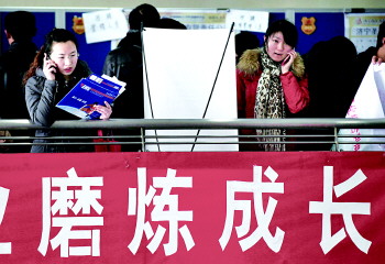 | 两名研究生在招聘会现场,招聘会上打出“磨练成长”的条幅(资料图)。本报记者 张晓科 摄 |  | 应聘者在用人单位摊前进行咨询(资料图)。本报记者 马辉 摄 |