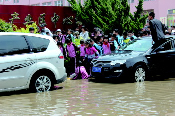 遇到下雨天,福山区产业区中心校的1400多名学生就犯愁。学校门前的民阜路积水严重,学生们只能蹚水上学。除了产业区中心校,烟台市实验中学的学生每天也要经过这条路,民阜路积水成了学生和家长们的一块心病。 民阜路一片汪洋,积水没过脚踝 28日上午,记者来到福山区民阜路北段,眼前的民阜路积水已经漫到路边的人行道。不少店主被迫把店铺门口摆放的摊位移到了室内。 “近几年每年下雨都会出现这样的情况,去年积水最深的时候已经没过膝盖,门前摆放的烧烤桌全都漂在水里。”一位饭店老板说,今年积水情况比往年还要严重,“这才下了两天小雨就已经这样,等雨季来了,我担心店里都要进水。” 经过民阜路的居民要么穿雨鞋从积水中穿过,要么站在路边搭顺风车。最深处的积水已经没过脚踝五六厘米,“这么深的水,走回家鞋肯定湿透了,骑着电动车也会溅得满身水,只能搭车回家。”一居民说。 蹚水上学,有的不慎摔在水中 中午11点半,到了产业区中心校放学的时间,不少家长聚集在学校门口接孩子。放学后,由于学校门前的民阜路全是积水,几百名学生全都涌到路边的绿化带。 记者看到,靠近水边的女孩一不小心摔倒在水中,手中的课本漂在积水中,在周围同学帮助下,女孩才从积水中站起来,捞起课本往绿化带里挤。 虽然靠着绿化带穿行,不少学生的鞋袜还是湿透了。每当有车经过,就会惹来一片惊呼。有些湿了鞋袜的学生,干脆直接从积水中穿过。 学校里的几名同学看到校门口的拥挤状况,直接从学校的围墙往外爬。“爬墙太危险,快下来,外面人多可以等会走。”保安及时将站在围墙内的几名同学抱了下来。 学生家长王女士说,孩子今年上小学二年级,每当到了雨季,她一天要给孩子准备三双鞋。“多换几双鞋无所谓,关键是孩子的脚一天都泡在水里,当家长的怎么能不心疼。” 一条积水路,影响了两所学校 就在产业区中心校的学生们差不多都离校的时候,民阜路上又涌来一批年龄稍大的学生。“我们是旁边烟台市实验中学的学生,每天上下学都要经过这条路。”一位初一的同学说。 记者了解到,民阜路是福山区盐场社区的一条南北主干道,除了产业区中心校的小学生,烟台市实验中学的部分学生及盐场社区居民的出行都要经过民阜路。 民阜路四周除了学校,还有不少小区及店铺。每当雨季来临,小区居民的出行成了问题,“现在不穿雨鞋根本没法出门。”福利莱小区的宋女士说,今天邻居去超市买雨鞋都没买到,“超市里的雨鞋都卖光了。” 市区有200多个积水点 根据目前的排查情况来看,烟台包括低洼地在内,存在积水情况的地方共有200多个,记者从市排水处了解到,积水原因各不相同。 从黄务往北,烟台整体地势南高北低,一场雨后水流很容易汇集。就拿南大街沃尔玛附近来说,受地势影响,南面一段很长的坡将雨水快速汇集,即使打开沿路所有井水篦子,也难将水第一时间排走。 而幸福立交桥下,常年轧出来的洼地,使周围的水都集中到这里。 本报记者 于明红 探访原因 地势低洼,排水管道堵塞 “这种情况已经好几年了,说起这事我觉得很惭愧。”产业区中心校的陈校长说,看着那么小的孩子每天穿着湿透了的鞋子上课,他也很心疼,“这个情况我已经和上级政府反应过很多次,领导们虽然重视,但目前始终没有找到好的解决办法。” 陈校长介绍,民阜路本来地势低洼,四周改造结束后,民阜路就更低洼了。“只要一下雨,雨水都往这条路上积。”另外民阜路的地下排水管道可能堵了,“现在路上的积水基本上排不出去。” 盐场社区居委会工作人员将井盖起开后,积水并没有排出。“里面堵得死死的,清理也没有多大作用。” 解决办法 等待完成旧城改造项目 谈起解决办法,盐场社区居民委员会办公室主任潘晓静有些沉默,“虽然领导们很重视,但目前看来确实没什么快速有效的解决办法。” 潘晓静说,有些居民提议在路两边加高台阶,这个方案治标不治本,目前盐场社区的资金也不到位。居委会现在能做的就是派人尽量清理井盖。目前来看只能靠抽水机往外排水。“要彻底解决阜路的积水问题,最好的办法就是完成盐场社区中心区的旧城改造项目。” 据了解,盐场社区的旧城改造项目早在十几年前就已经开始实施,中心区的改造如今才正式开始,而位于中心区靠北位置的产业区中心校要等到几年之后才能开始推进,这意味着未来几年,两个学校的学生还要蹚水上学。 本报记者 于明红