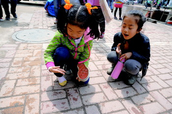 | 民阜路积水严重,学生们从绿化带旁通过,一名小女孩不慎摔倒在水中。 本报记者 于明红 摄 |  | 蹚水后鞋子袜子都湿了,一名小女孩脱下鞋子倒水。 本报记者 于明红 摄 |