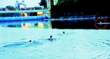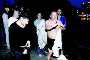 | 3位热心市民游向河中男子。本报记者 孙国祥 摄 |  | 3位热心市民回到岸边。
