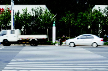 4月28日,在太阳湖路与幸福大道路口,人行横道的一端被数米宽的绿化带隔断,行人和非机动车无法进入非机动车道,只能与快速行驶的车辆混行。 本报记者 马志勇 摄