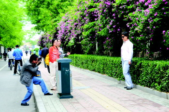 28日,在岱宗大街山东农业大学南门附近,路边的蔷薇花开得正艳,许多人拍照留下春光。 本报记者 赵苏炜 摄