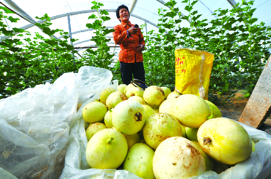 28日上午,邹平县码头镇前安村村民张庆霞种的第一茬甜瓜上市了。前安村大部分村民像张庆霞一样,通过土地流转搞大棚瓜菜种植,每个大棚年纯利润超过2万元,村民都尝到了土地流转带来的“甜头”。当天,码头镇第三届甜瓜采摘节在前安村开幕。
