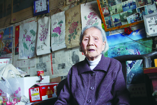 | 老人背后墙上挂着的便是她画的画。 本报记者 刘涛 摄 |