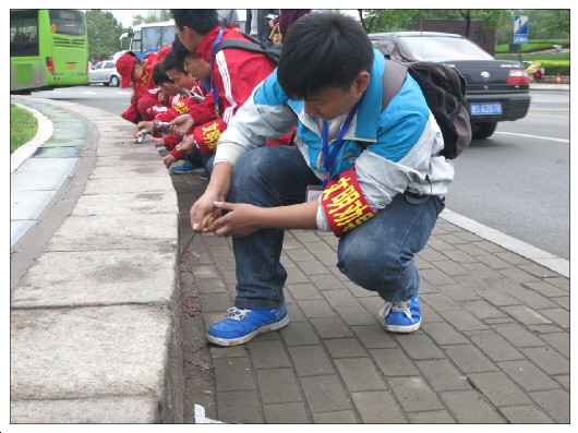 莱芜职业技术学院的学生在认真清理转盘石上的红纸