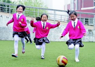 | 高区实验小学学生穿着班服在操场上玩耍。见习记者 陈乃彰 摄 |