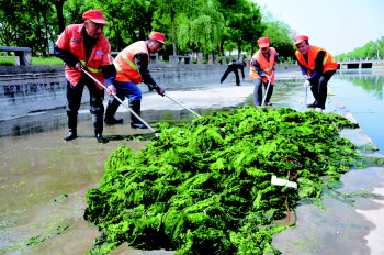水绵如果不及时清理,会变质腐烂并散发出臭味,给居民生活带来困扰。 本报记者 王鸿哲 摄
