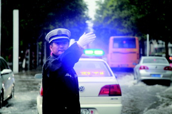 | 刘鹏在接受记者采访。 |  | 台风来临,刘鹏冒雨指挥交通。 |