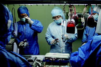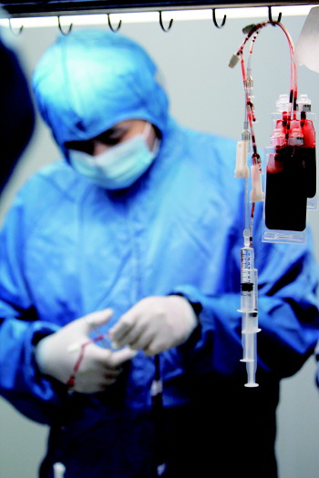 | |  | 制备好的脐血放置在金属盒内,等待被放入液氮罐。(资料片) |  | 工作人员将细胞保护剂注入脐血袋。(资料片) |