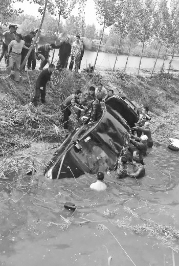 本报德州4月29日讯(记者 孙婷婷) “快救人啊,快救人!”4月28日下午,在禹城石屯镇砖窑附近,发生了一起车祸。一辆载有5人的轿车失控扎进路边的河沟,万分危急之下,30多名附近村子的村民和路人手脚并用,用粗绳、棍棒和铁锹等简陋工具,救出三名被困者,另外两人不幸身亡。