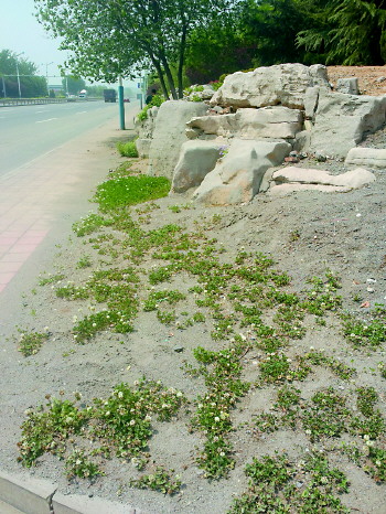 29日上午,记者跟随张先生来到经十东路。在靠近鸡山村站牌附近,记者看到路旁绿化带里种植的三叶草有一部分已经被渣土覆盖,靠近马路边的绿化带的草皮已经退化,就像被剃了头一样。
