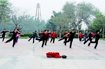 每天清晨,不少市民在锦绣川的小广场上跳广场舞锻炼身体。 本报记者 王小会 摄