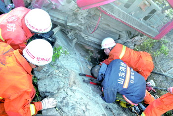 消防官兵在救助车内被困人员。