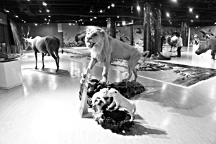 五一小长假,济宁科技馆为市民准备了一场盛大的非洲野生动物展。狮子、长颈鹿、鳄鱼、火烈鸟,数十种野生动物标本,把科技馆内打造成了一个非洲大草原的世界,逼真的动物,让孩子们体验到大自然的魅力,也能学到不少自然界的知识。图为野生动物展一角。 本报记者 汪泷 摄