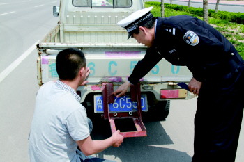 ◤4月29日,齐河交警查获一辆遮挡号牌的轻型卡车。司机王某交代,这个车是专门拉三轮车的,一直未卸下来,没想到图省事却违反了交通法规而被罚。