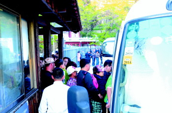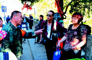 | 2日,泰山后山索道被9级风吹停,位于前山的中天门景区承受的分流游客压力很大。 |  | 2日,两游客背帐篷登山,被景区工作人员拦住。 本报记者 乔显佳 摄 |