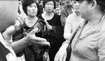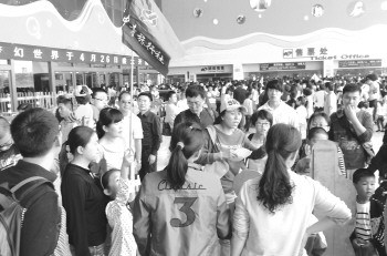 | 5月1日,齐河泉城海洋极地世界景区外,一旅游团正组织清点游客。 本报记者 乔显佳 摄 |  | 在北京一日游景点外,有外地游客因自费项目向导游讨说法。