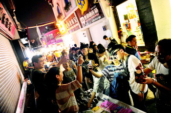 当如潮的人流退去,午夜的空寂一样属于芙蓉街。作为济南最具地域特色的一条老街巷,它繁华,又不止于此。 4月30日-5月2日,我们既到喧嚣的人群中,也在午夜的昏暗一隅,聆听芙蓉街的生息:它是摊贩们多收了三五斗的兀自欣喜,它是环卫工人面对11吨垃圾时的一次次弯腰,它是在疲惫中筹备次日生意的盘算。 文/本报见习记者 韩笑 田宇 片/本报记者 王媛 4平米的臭豆腐店 早上8点熙攘到午夜 5月1日晚11点左右,一场突如其来的大风夹带着一阵急雨,吹散了芙蓉街上的人潮。由于担心一场大雨的到来,已经奋战了一天的摊主们,在疲倦和喜悦中收拾着自己的小摊,而此时他们摊上的食物早已所剩无几。 “还有么?来份臭豆腐吧。”“好嘞,要不要辣椒?”油锅中的豆腐被捞出,放在作料盘里翻滚几下,金黄的10块豆腐上均匀地裹上一层孜然和辣椒。5秒之后,一份臭豆腐就被递到了客人手中,这位女生站在街头和男朋友冒着雨,一起分享了这份美味。 “差不多可以收了。”卖完这份豆腐,店长李光宝对小徒弟徐鹤说。此时,李光宝手机上显示的时间是23点20分。归置物品、擦拭工作台、清点一天的营业额,收拾妥当后,李光宝点燃了一支烟,“今天卖出去了2000多份豆腐,像陀螺一样转了一天,抽根烟解解乏。”李光宝说。 南京鸭血粉丝、北京爆肚、韩国寿司、烤鱿鱼、章鱼小丸子、烤猪蹄、菠萝饭……当年轻人把“吃货”作为自己的标签,追求品遍各地美食时,芙蓉街就成了泉城最热闹的小吃街。熙攘的人群抬高了芙蓉街的店铺租金,让很多店铺都不得不“蜗居”一隅。李光宝管理的这家火龙田记臭豆腐店只有4平米大小。店内堆放着豆腐、包装盒,李光宝和徐鹤只有站立和转身的空间,这一站就从早上8点直到午夜。 小伙子摆俩摊 一天卖出上千生蚝 李光宝在这里工作两年多,当天早上来店里时,用三轮车拉来了15箱豆腐。当时,他寻思着,“这是平常的两倍,应该够了。看今天的情况吧,不够了就赶紧跟供货的联系,让他们再送些过来。”但是,生意的火爆还是让他意外。 临近午夜,火龙臭豆腐旁边的奶茶店也准备下班了,店员打开收银抽屉,清点着一天的营业额。听说臭豆腐店卖了2000来份,一个店员笑着说,“要是我们能卖他们一半就好了,今天芙蓉街限行,我们店在出口这儿,影响了生意,要不还能卖得更好些。” 卖烤生蚝的小伙子把摊位前人们吃剩的生蚝壳收入垃圾桶,“今天摆了两个摊,卖出去一千多份,半小时前就卖光了。”小伙子脸上写满了兴奋,“专门为今天备了一批新鲜的好货,最大的一个生蚝我卖了55块钱,最便宜的一个也得15块。” 卖手抓饼的老板娘打开收钱的抽屉,放松地靠在椅子上,把钱按大小收好;卖烤鱿鱼的摊贩把剩下的鱿鱼装到食品袋里,卖烤猪蹄的姑娘熄灭了炉子上的炭火。 凌晨到来,小店的灯光一家家熄灭,卷帘门也关上了。“哟,你也收了啊!”“卖得还不错吧?”店主们骑上电动三轮车,互相打着招呼离开这条老街,结束他们劳碌的一天。 深夜为芙蓉街洗脸 11吨垃圾累坏清洁工 没有了叫卖声,原本游人如织的街道显得宽阔了许多。映入眼帘的是满地的垃圾,饮料盒、竹签、塑料袋横着竖着,地上铺了一层油污。 午夜的芙蓉街正要归于寂静,环卫工人们开始收拾残局。“平时这条街上有5个清洁工,今天15个人全部都出动了。今天人实在是太多了,像赶羊一样,这些小吃咋那么招人喜欢呢?”清洁工王师傅说。 凌晨1点,清洁工赵女士把地上的垃圾扫成一堆一堆,随后再由工友们把垃圾装进垃圾桶。垃圾太多,有时候清洁工就直接用手把垃圾捧到垃圾桶内。“一到放假我们就要加班。白天随时清扫地上的垃圾,等晚上人都走了,再彻底打扫,地上油太多,得下力气扫才行。”赵女士说。 不一会儿,开着垃圾车运垃圾的芦师傅赶来,把装满垃圾的垃圾桶运到清扫车上带走。“我还真没数今天运了多少趟,只要垃圾桶满了,我和另外一个伙计就闲不住了。”42岁的芦师傅从上午9点上岗,一直忙活到下半夜。 往车上扛了一天垃圾桶,芦师傅的脸上和工作服上染了一层油污,宽松的工作服已经湿透了。“今天下午5点开始,一辆8吨的垃圾车就装满了,另一辆3吨的车也差不多了。”芦师傅说。 直到凌晨2点,清洁工才在昏暗的灯光下结束一天的工作。3点半,又会有另一拨清洁工赶来接班,开着水车把街巷的地面全部刷一遍。褪去昨日的浊衣,芙蓉街的一天又开始了。