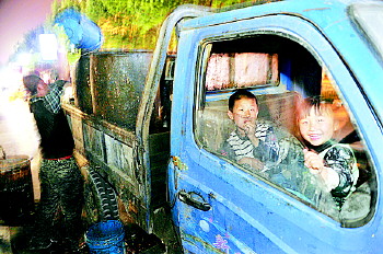 | 1日晚上11点多,芙蓉街上依然游人如织。 |  | 1日晚11点多,李师傅带着9岁的儿子和3岁的女儿在芙蓉街口拉泔水。 |