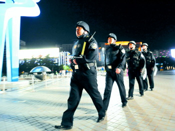 | 1日晚上9点多,济南历城巡警三中队接到一母亲报警称女儿和同学出去玩未归、两人电话也突然关机的报案后迅速来到富翔天地小区,帮报案人寻找女儿。 |  | 济南历下巡警一中队民警在泉城广场进行武装巡逻。 |