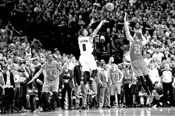 | 利拉德(左)在比赛中投出压哨三分球。 新华社发 |
