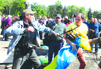 | 3日,亲俄分子在发生火灾的工会大楼外献花悼念死者,试图烧毁乌克兰国旗,并与亲乌人士和驻守警察发生争执。 CFP供图 |  | 2日,奥巴马(右)与默克尔出席联合记者会。 新华社发