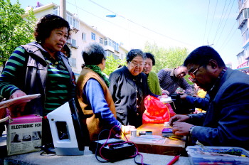 本报5月3日讯(记者 金夏瑞) “咦,大哥你来的真早,你排第一,我们第二。一会师傅来了你先修,我们排你后面。”上午8点10分,两位前来维修的市民聊起了天。3日,本报社区帮办走进迎西社区,在卫生服务站门前为大家提供了家电维修、医疗咨询、法律咨询、开换锁等多种服务。 孙先生家住毓璜顶街道办附近,3日一大早他就带着收音机来迎西社区找帮办。“你们每期报纸我都看,这个社区帮办栏目真不错。我来看看能不能把我这收音机修好。”孙先生估计是小毛病,可找不到会修的人。 同样排队等待莱山区绿色家园的胡女士,上期活动胡女士要修的电热器,没有合适的配件,义工于师傅去三站市场找配件,才将电热器修好。这次,胡女士专程来感谢于师傅。于师傅虽说不收钱,胡女士却赶紧将配件钱塞给于师傅,她说,“于师傅为我专门跑腿已经很不好意思了,哪还能让他花钱。” 9点,活动刚刚开始,电饭锅、电蚊拍、电饼铛、热水壶各种各样的家电就满满的堆在桌子上,“你第一,我第二”,前来维修的人们自主将自家电器编上了号,生怕来不及修。两位维修师傅忙得连水都顾不上喝,一直忙活到活动结束,修好了居民们送来的十余件电器。 本报社区帮办走进迎西社区,维修师傅正在为居民修家电。 本报记者 柳斌 摄