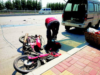 3日中午12点半左右,港城西大街发生一起车祸,一女子骑摩托为躲一辆同向行驶突然左转的三轮车,钻进了同向行驶的货车轮下,女子当场被轧死。 据现场目击者介绍,摩托车驾驶者是一名四十岁左右的女子,戴了头盔,穿一条黑色裤子,突然左拐的三轮车车主是一名看上去50多岁的人,车上装着草莓。目前,事故原因还在进一步调查当中。图为处理事故的工作人员正在清理现场。本报记者 张晶 摄影报道 请刘先生领取20元线索费