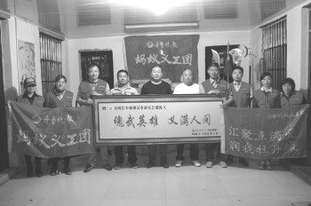 5月2日,本报蚂蚁义工团东明分团将印有“魂武英雄 义满人间”的牌匾送到东明爱心人士、东明少林佛汉拳第七代传人邢俊立手中,以表示他对义工活动的支持。