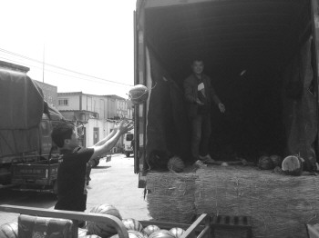 | 水果批发市场内,瓜贩们正搬运西瓜。本报见习记者 康宇 摄。 |