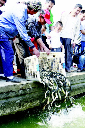 “五一”期间,第二届“江北水城·运河古都”放鱼节在东昌湖金凤广场启动,现场向东昌湖放流80万各种鱼苗。此次放鱼节期间一共将向东昌湖、双海湖、金牛湖、鱼丘湖、马颊河、徒骇河等城市水系和主要河流放流草鱼、鲢鱼、青鱼、鳙鱼、甲鱼、锦鲤等260万尾。 本报记者 李军 摄