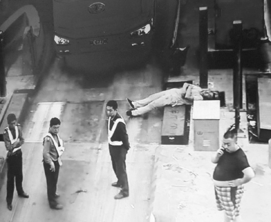 | 躺倒者为司机,打电话者为车主。 视频截屏 |
