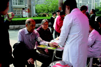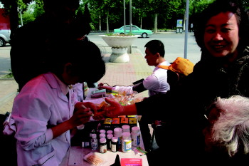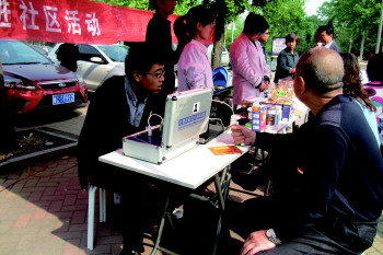 | 漱玉平民大药房工作人员为居民测血糖。 本报见习记者 刘晓 摄 |  | 工作人员为居民测量血压。 本报见习记者 刘晓 摄 |  | 工作人员为居民进行微量元素检测。